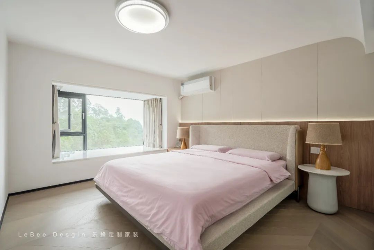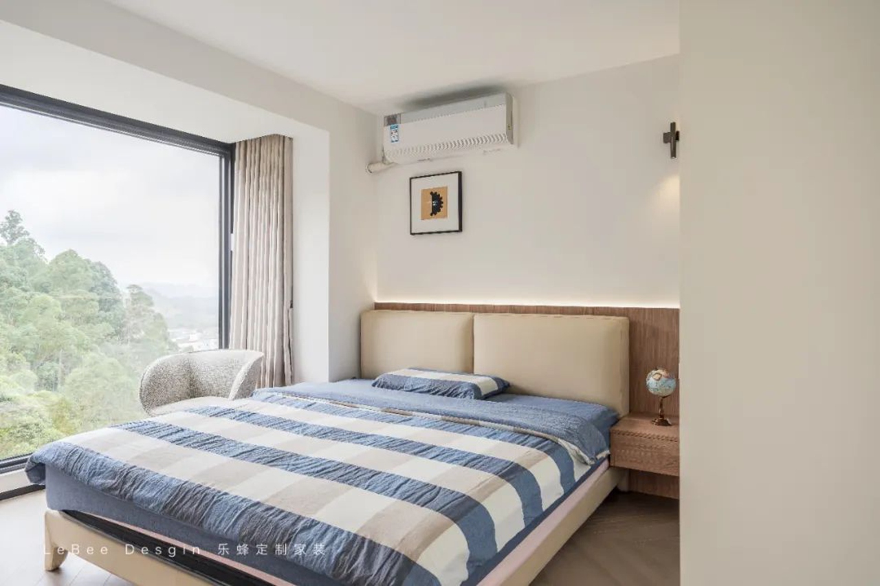 主臥以灰棕色調為主,背景墻采用皮革硬包與木格柵拼接,搭配無主燈設計,營造舒緩氛圍。落地窗風窗處理,俯瞰深圳景觀。