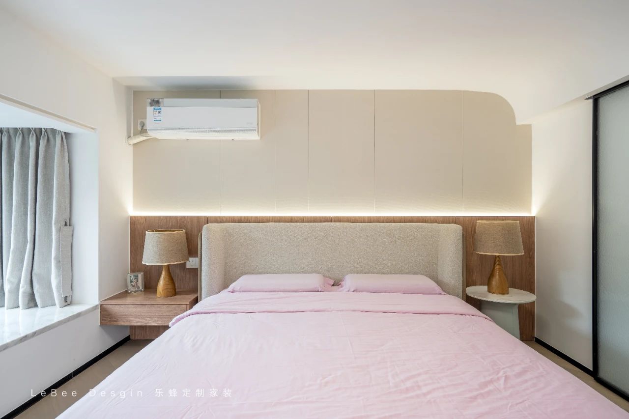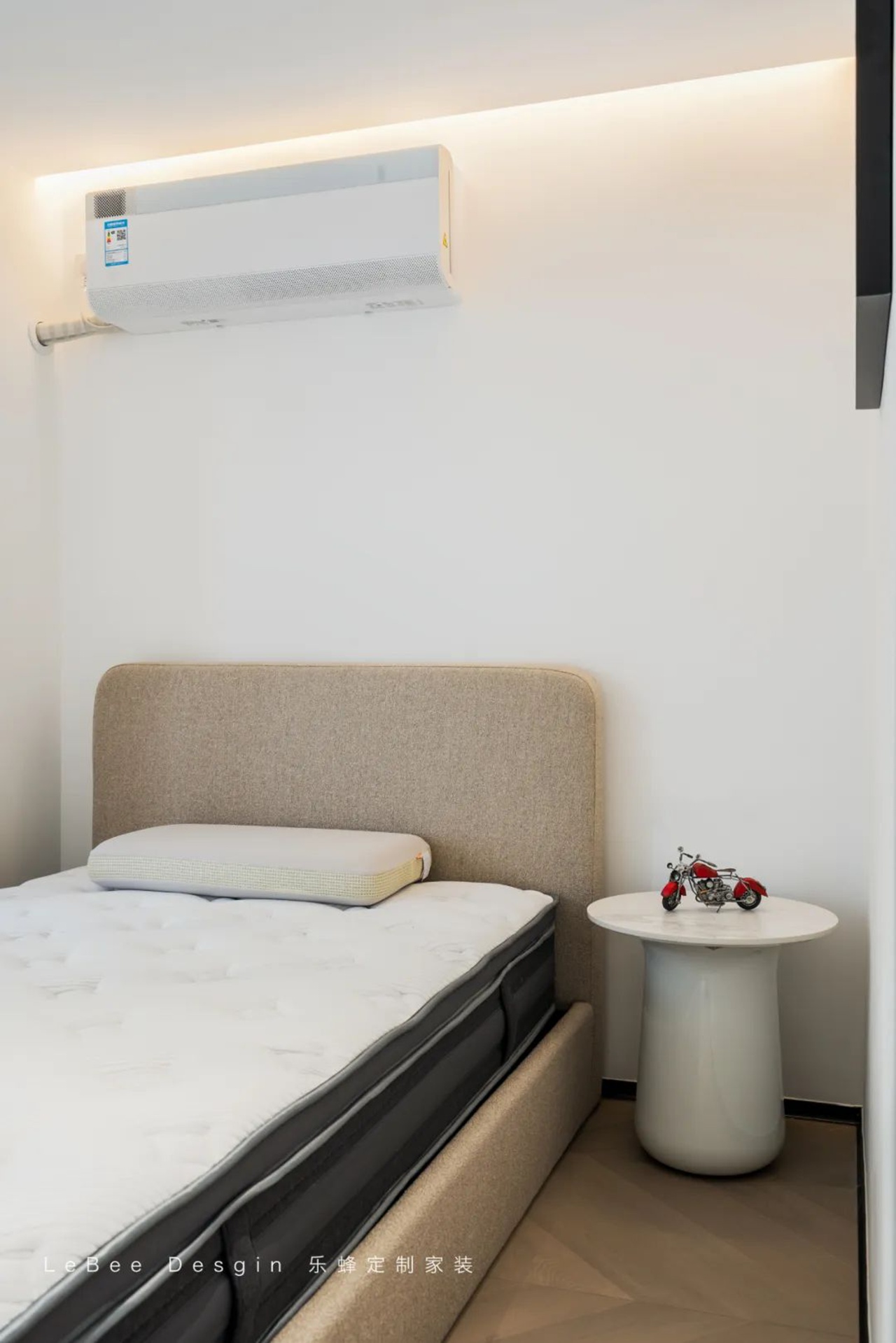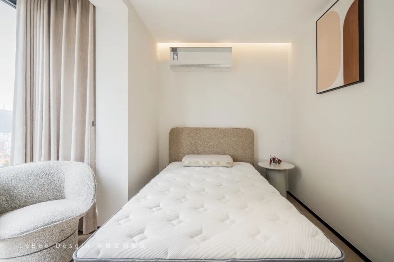 次臥以簡單使用為主,定制簡易的床品柜體,還可以充當客房來使用。