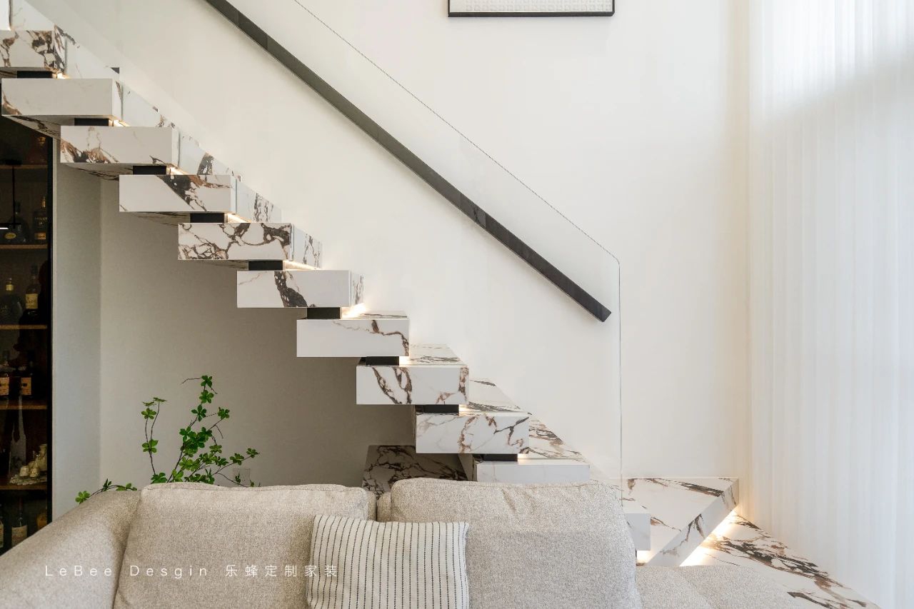 懸浮式樓梯以鋼結構+玻璃護欄呈現,既保證通透性,又成為空間的藝術焦點。