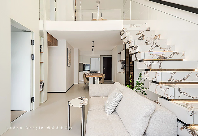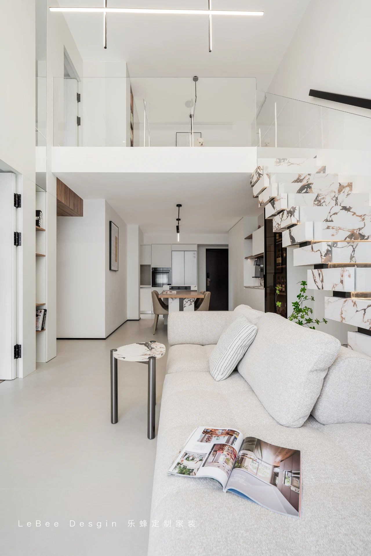 設計師通過極簡線條、天然材質與光影互動,將層高優勢與功能需求完美結合,打造出既開放又私密、既實用又充滿藝術感的都市居所。