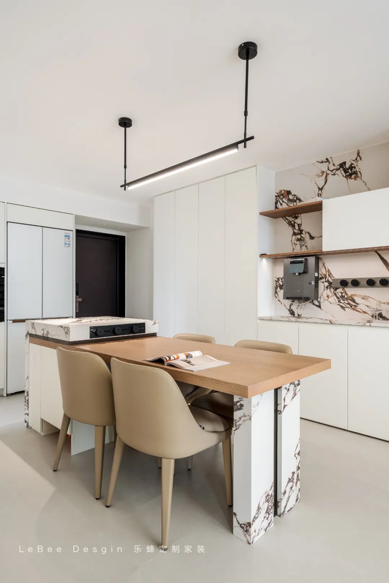 墻面以白色藝術漆為主,局部點綴裝飾畫;地面通鋪啞光大理石瓷磚,搭配淺色亞麻窗簾,平衡冷峻與溫潤。軟裝選用低飽和度家具,木飾面成為空間跳色。