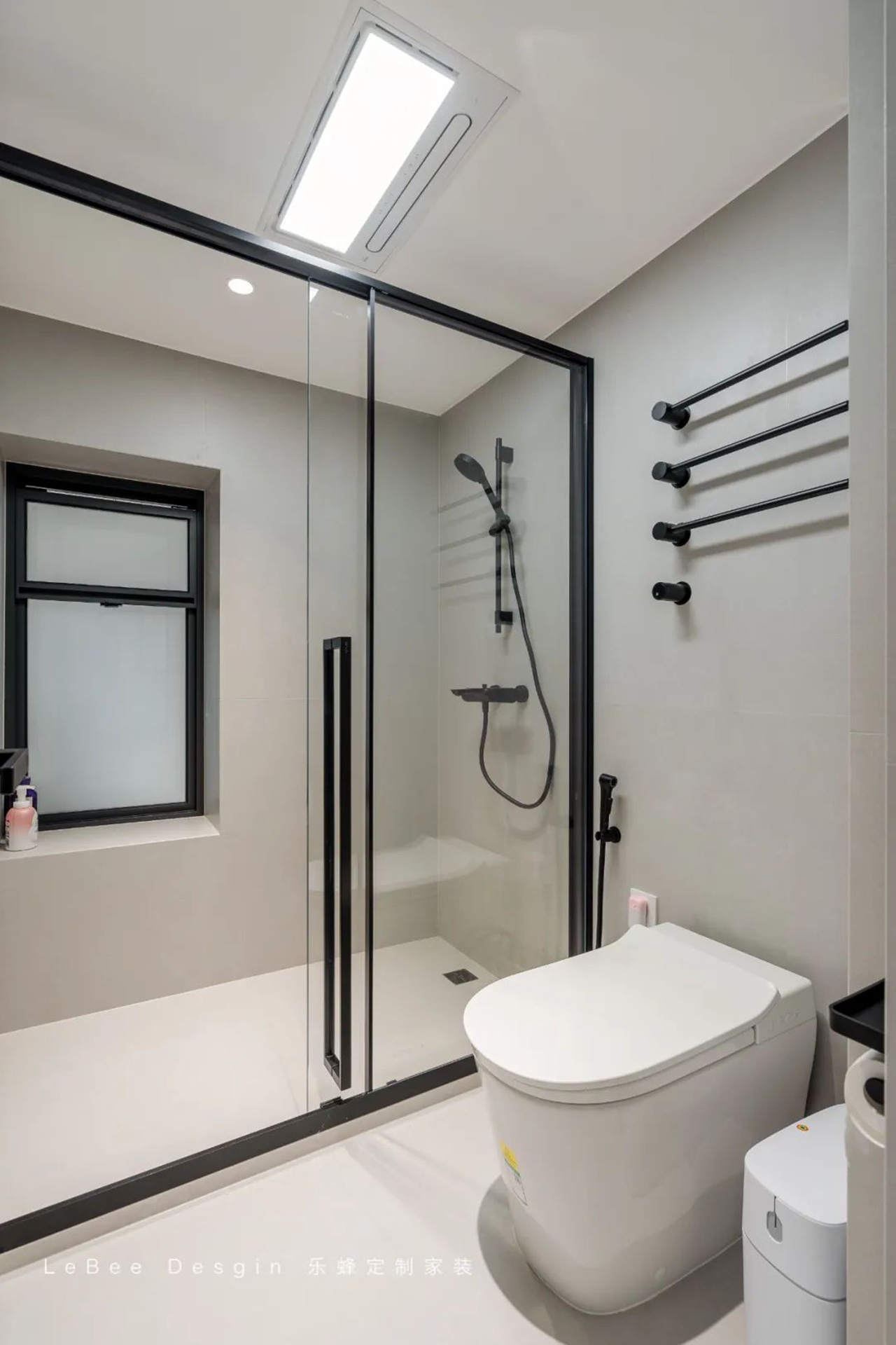 公衛干濕分離,臺盆區外置,拱形鏡面與懸空柜體延續整體簡約調性。