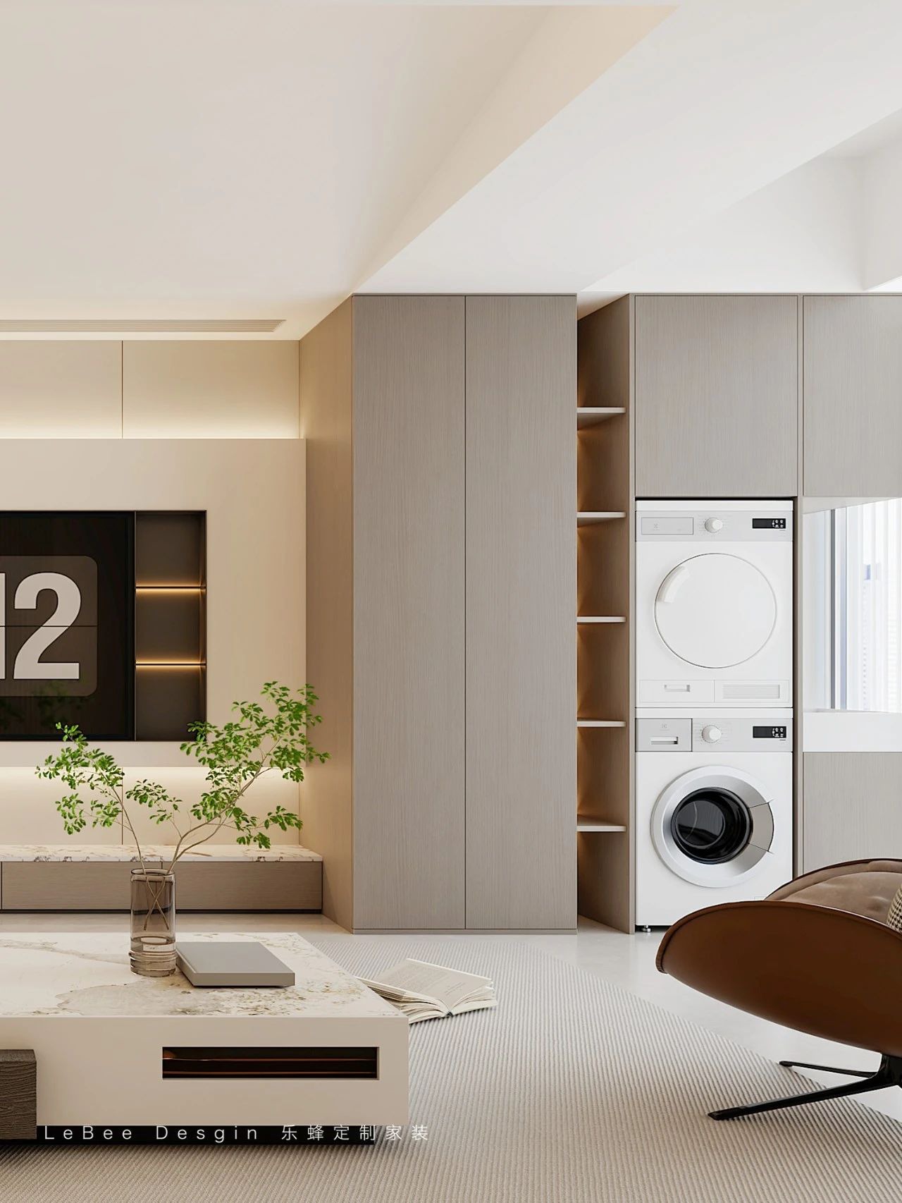 背景墻木飾面從客廳延伸至陽臺埡口,與陽臺定制柜自然銜接,形成“視覺長廊”。陽臺柜采用同色系隱藏門,內置家政清潔工具,保證美觀的同時強化收納功能。