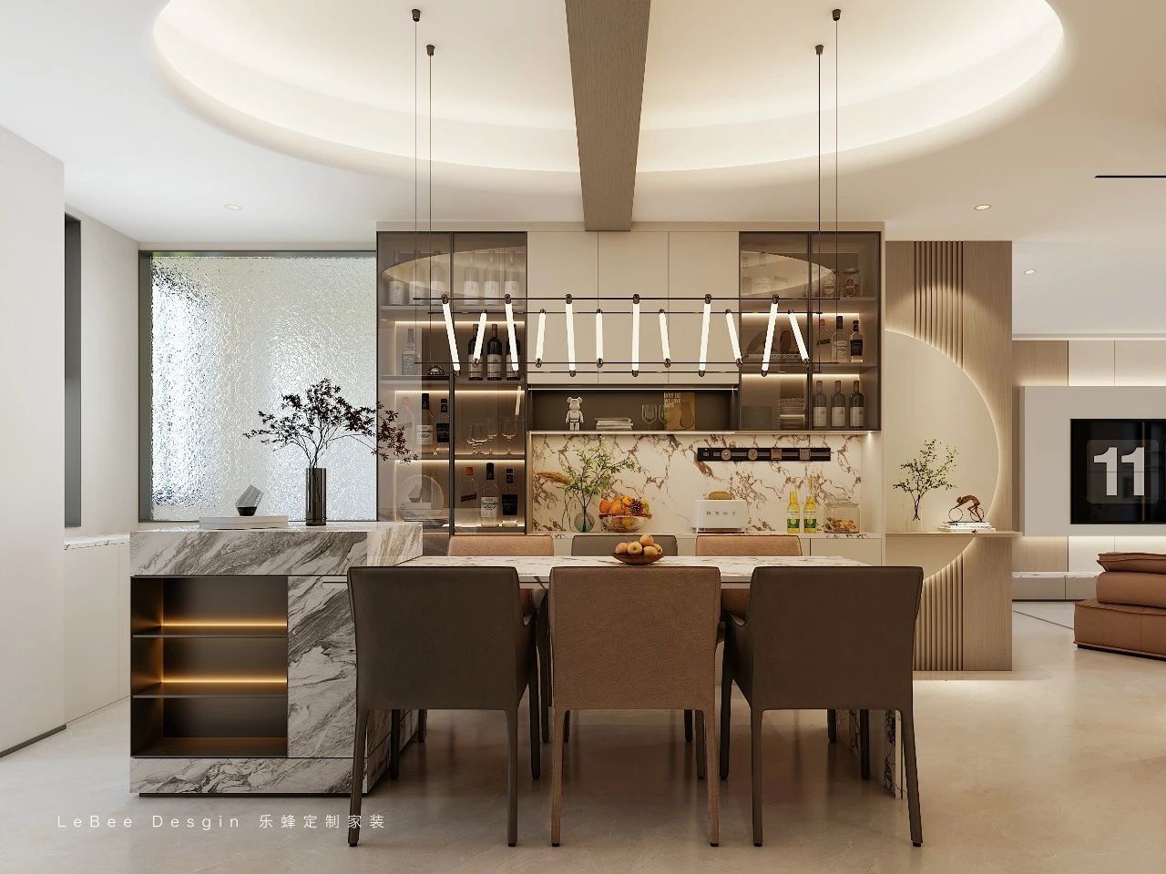 餐廳3米長巖板餐桌與暖咖色木飾面島臺無縫銜接,臺面延伸至島臺側面形成吧臺區,滿足簡餐、辦公、親子互動等多場景需求。