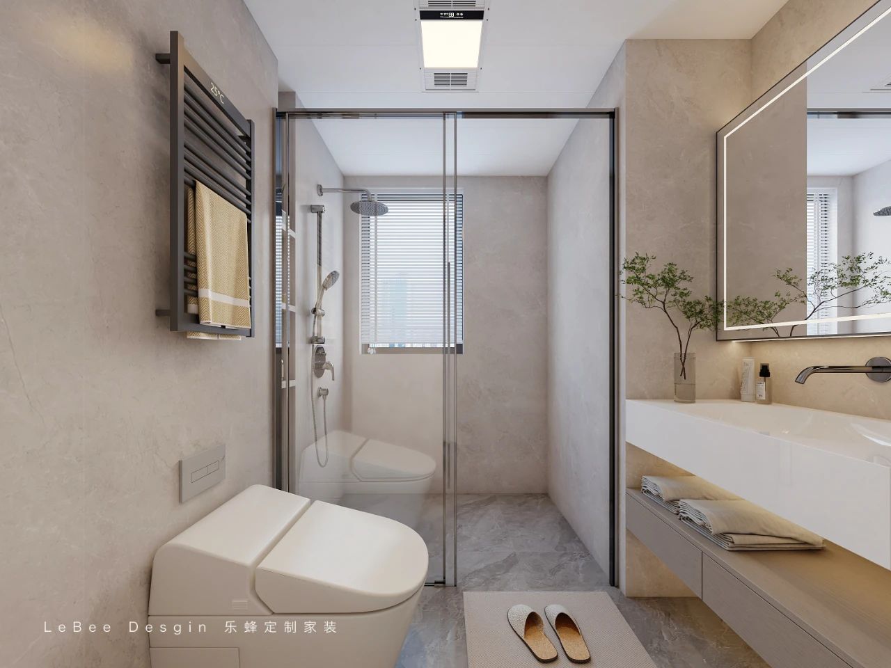 長虹玻璃隔斷劃分淋浴區,智能馬桶節省空間,智能鏡柜:雙面鏡柜延伸視覺,內置除霧功能與LED燈帶,下方懸空浴室柜便于清潔。