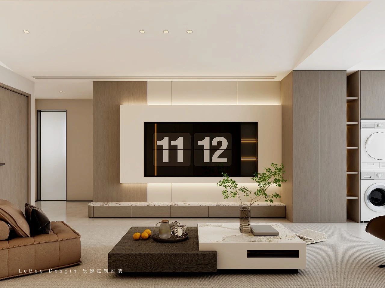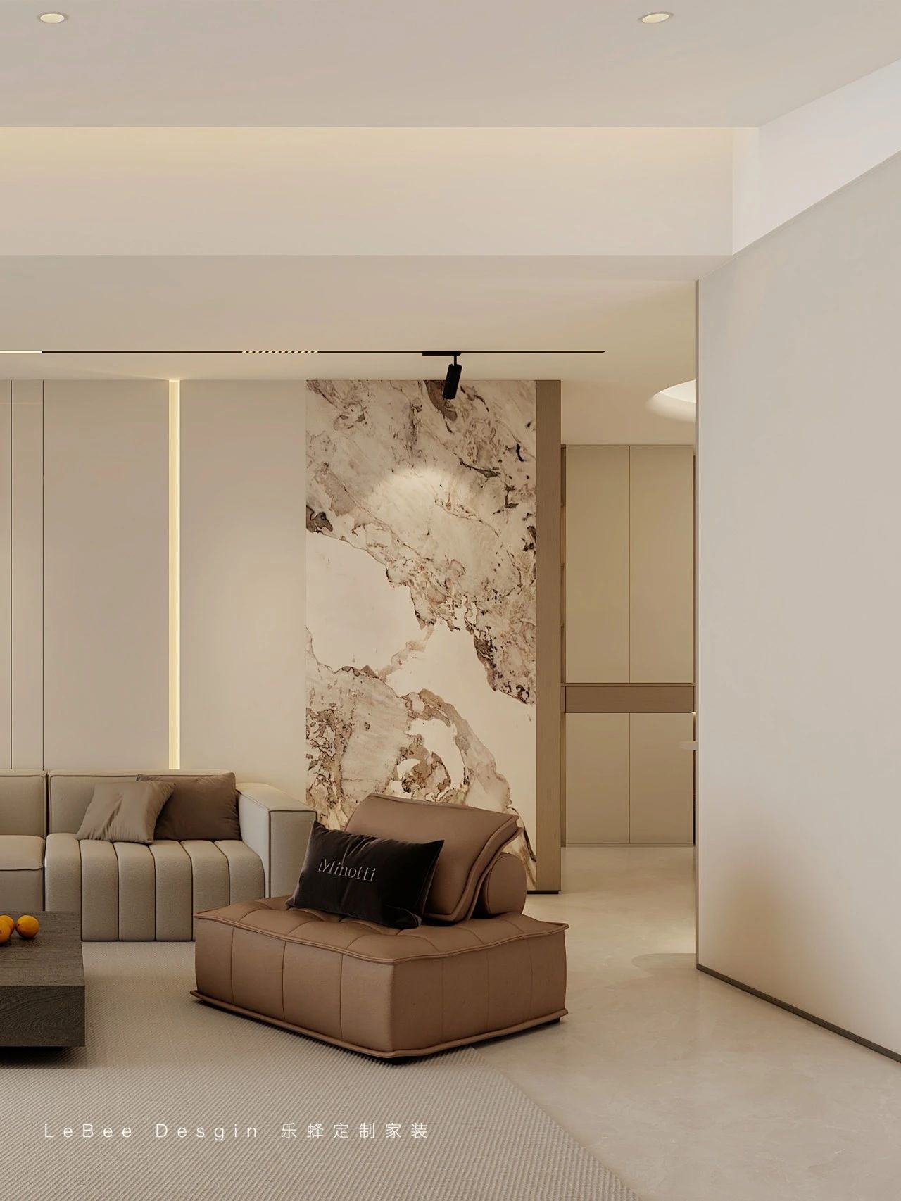 本案為140㎡四居室,設計師以暖咖色系為基調,融合意式輕奢的簡約與質感,打造出沉穩內斂的高級生活空間。