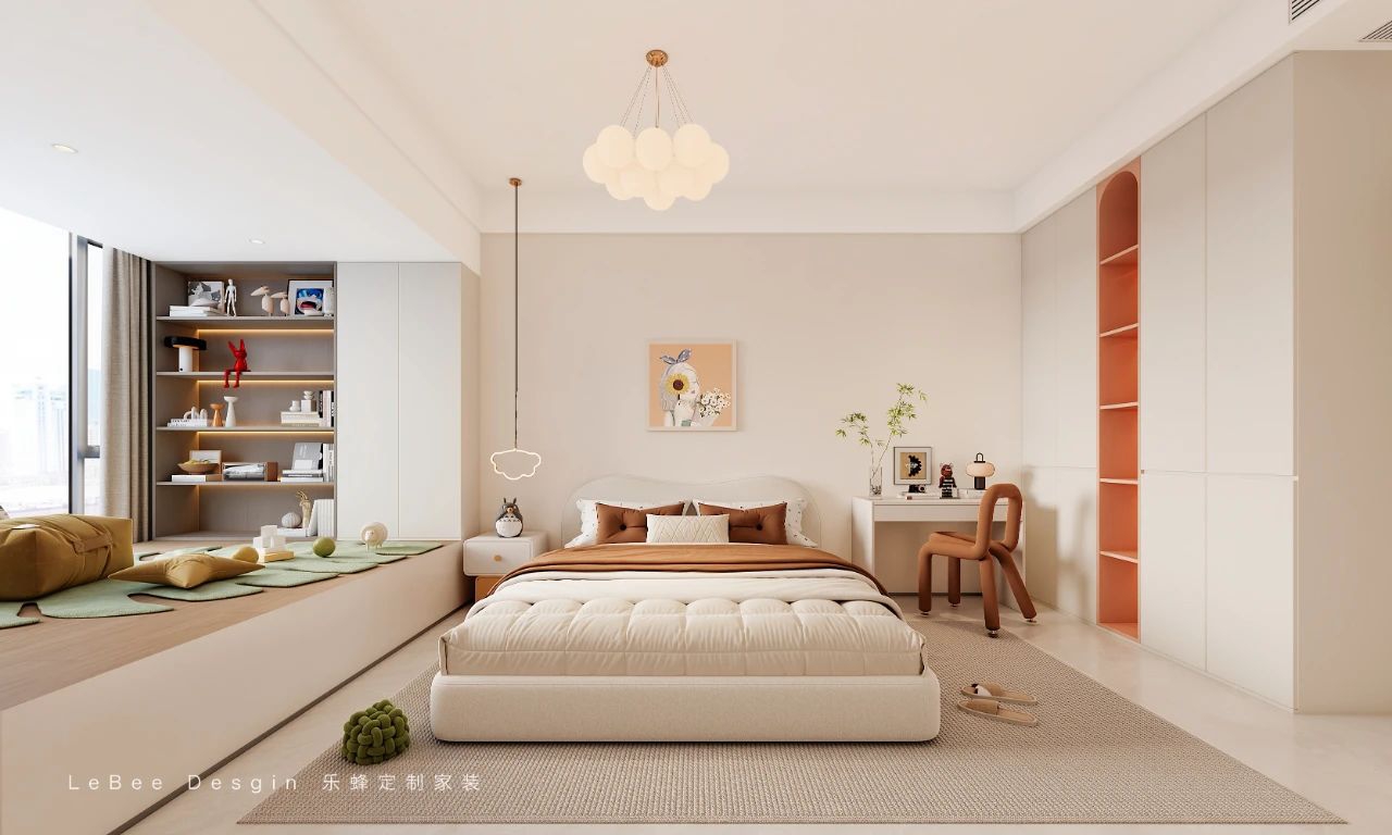 女孩房淺粉色墻面與奶油色家具柔和過渡,云朵形吊燈增添夢幻感。