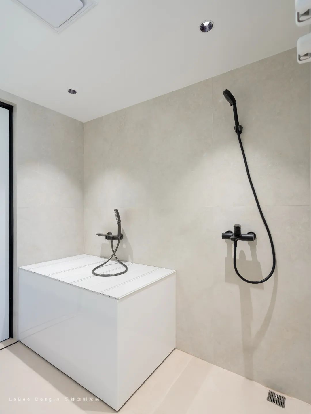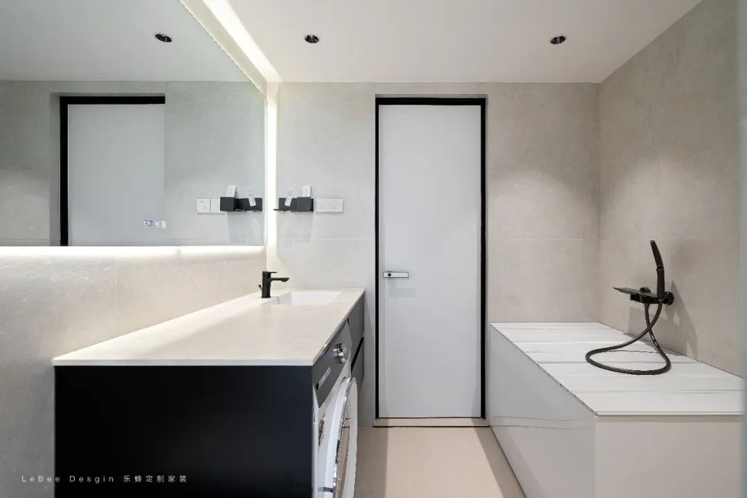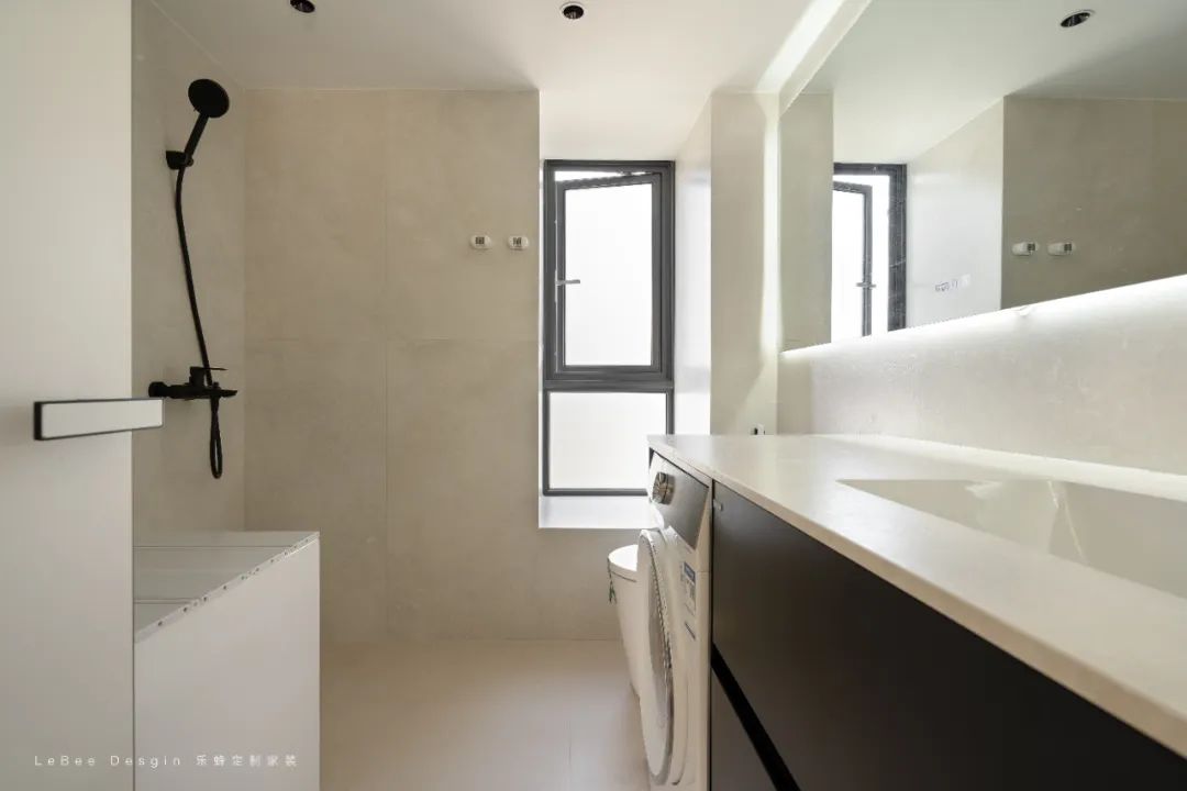 以黑白灰為主色調,搭配淺米色瓷磚,營造簡潔、干凈、時尚的視覺效果。黑色水龍頭、淋浴噴頭與白色柜體、洗手臺形成對比,增添設計感。