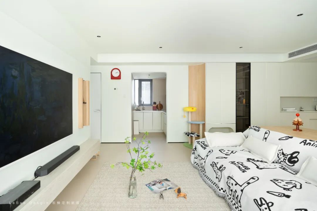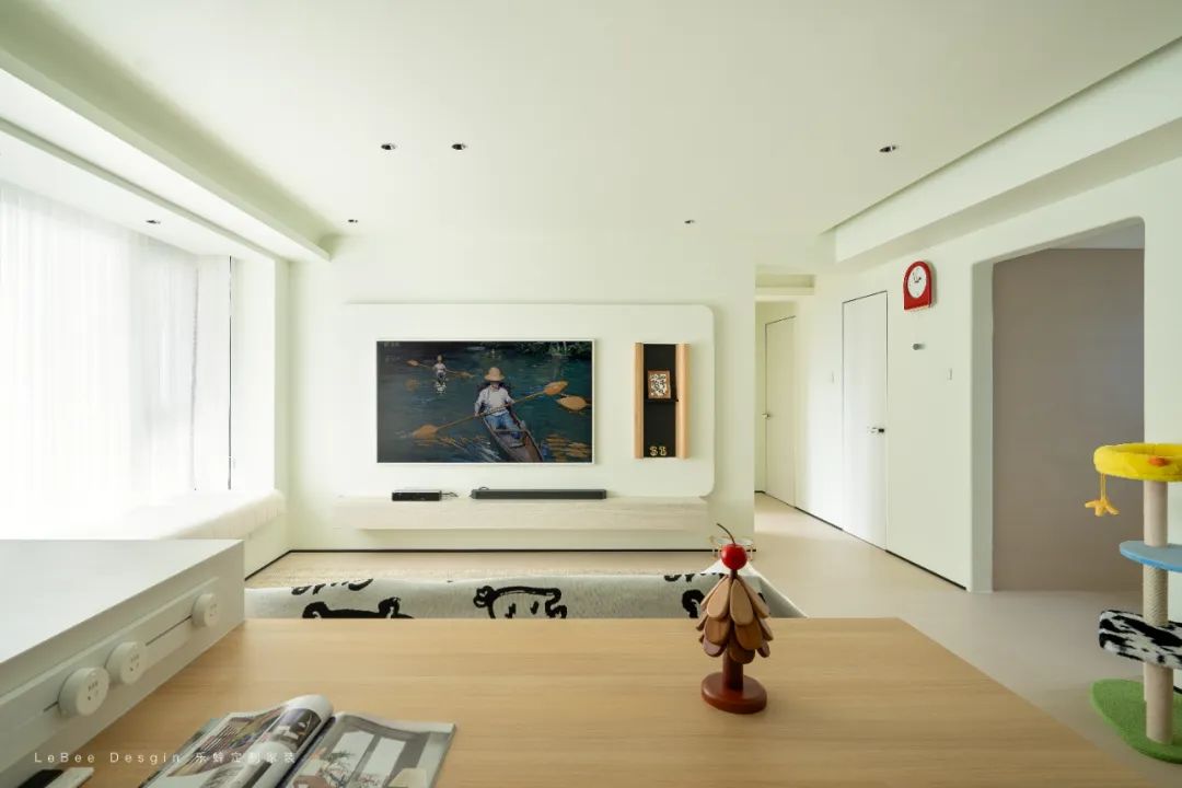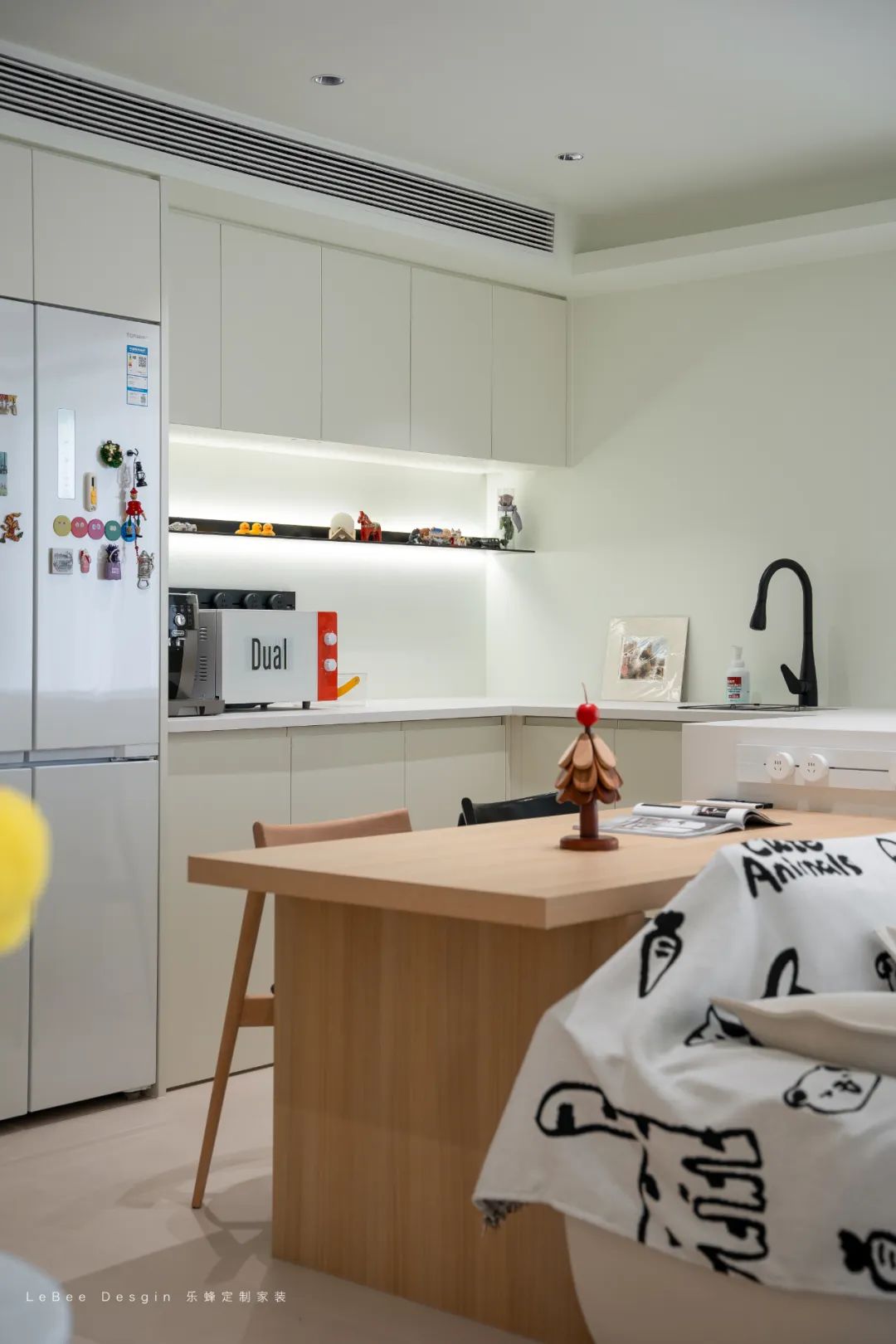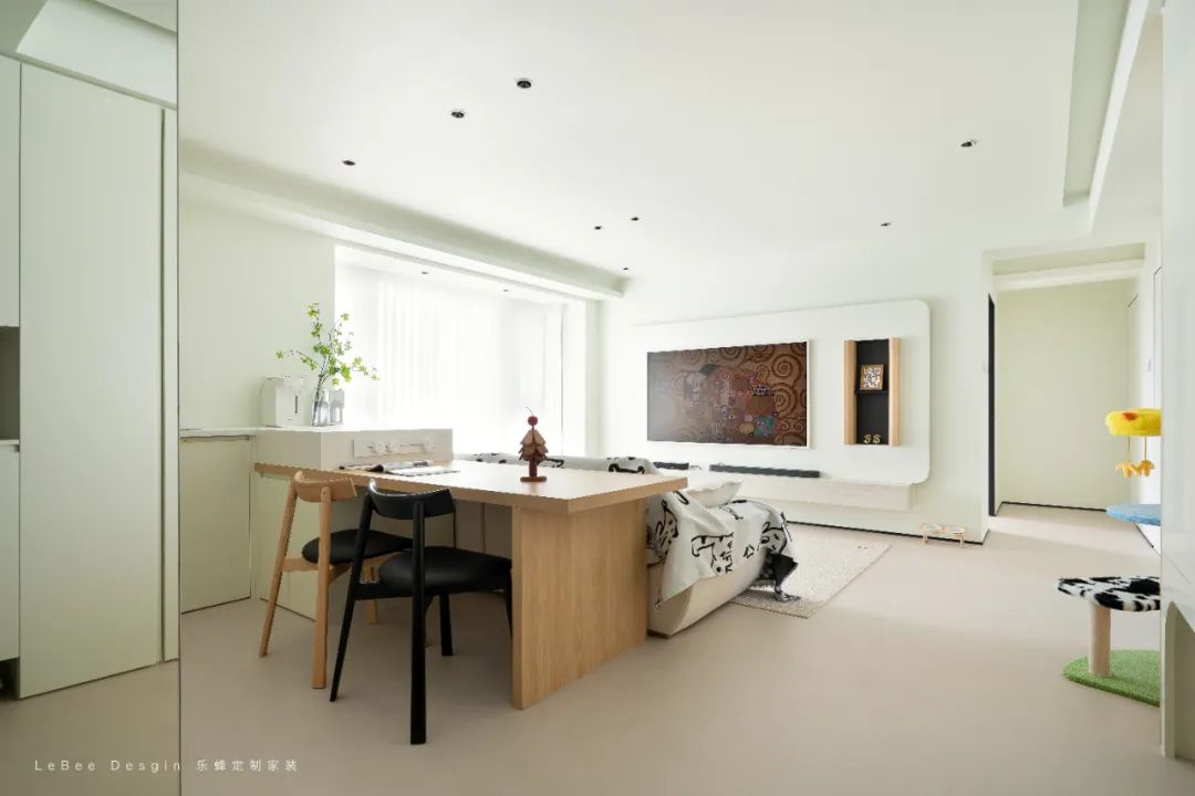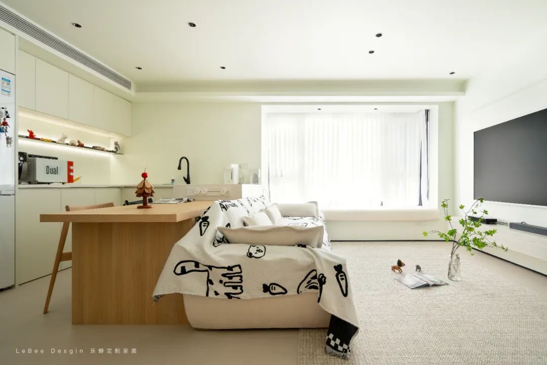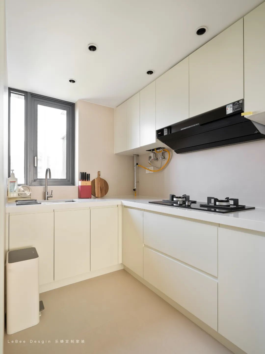 整體空間以低飽和度的奶油色調為主,墻面、天花板及柜體選用奶白色、米杏色等,營造出柔和、溫馨氛圍,奠定了奶油風基礎格調。