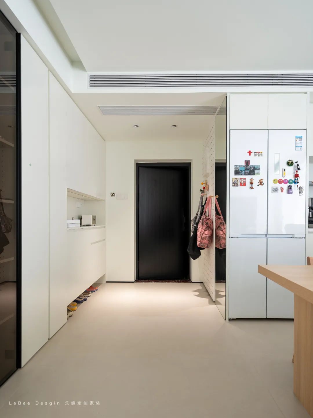 入戶處設置了通頂的一體化定制柜,提供了大量的儲物空間 ,可用于收納鞋子、衣物、雜物等。