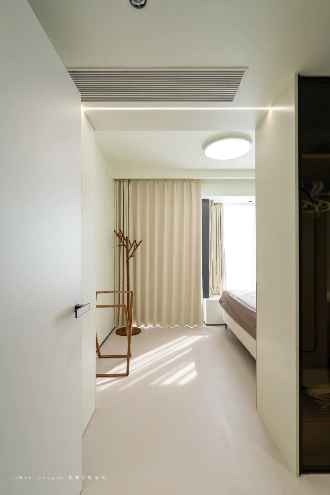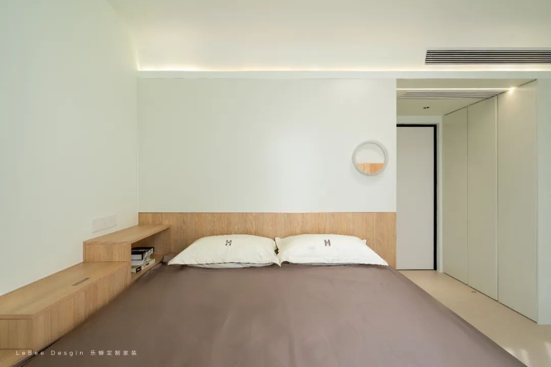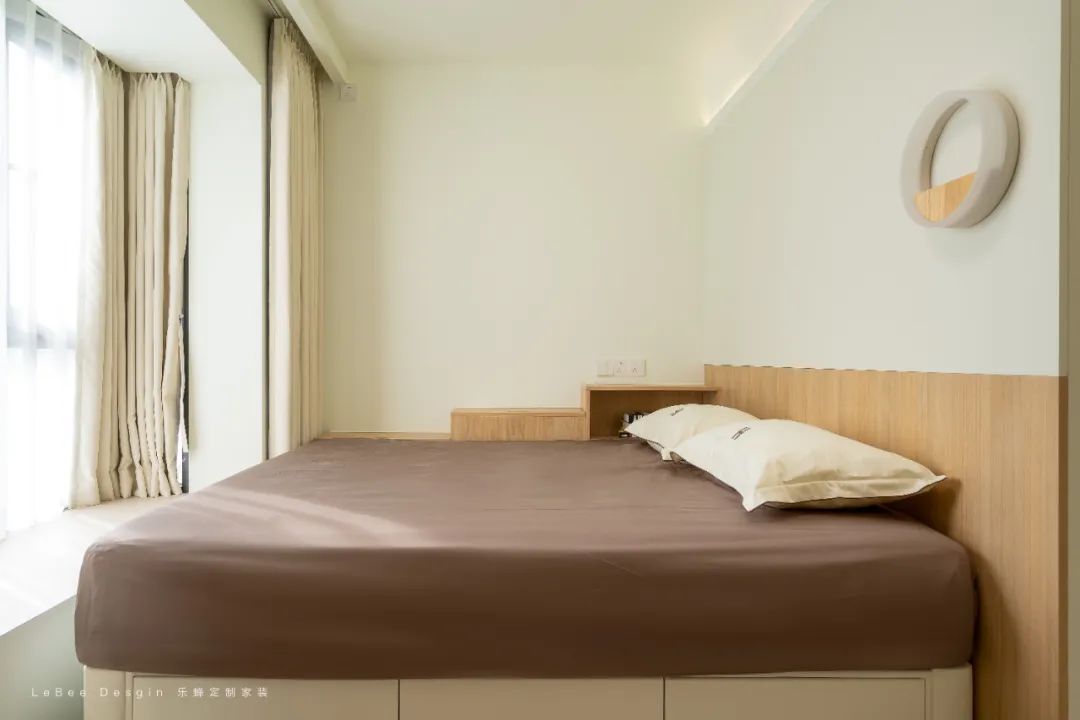 主臥用淡雅的米白色,營造出柔和、寧靜的氛圍;床頭板使用淺木色,增添自然溫暖感;棕色床品沉穩而不失溫馨,與整體色調和諧相融。