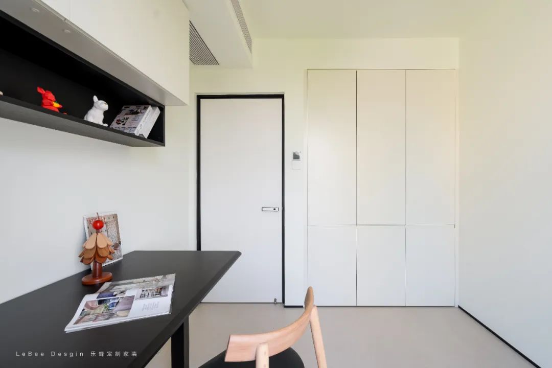 以黑白為主色調,黑色書桌和擱架與白色墻面、柜體形成鮮明對比,簡約而經典。少量木色元素(椅子)的加入,增添自然溫暖感。