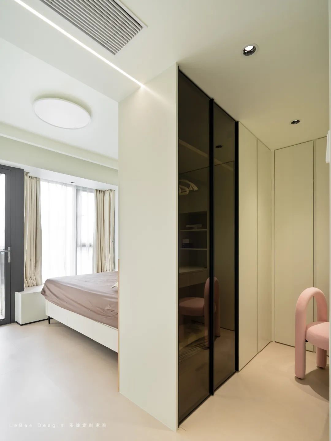 衣帽間采用到頂式設計,白色柜門搭配部分黑色玻璃柜門,簡約時尚。玻璃柜門可展示內部衣物,方便尋找搭配,同時增添空間通透感。
