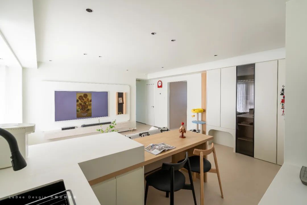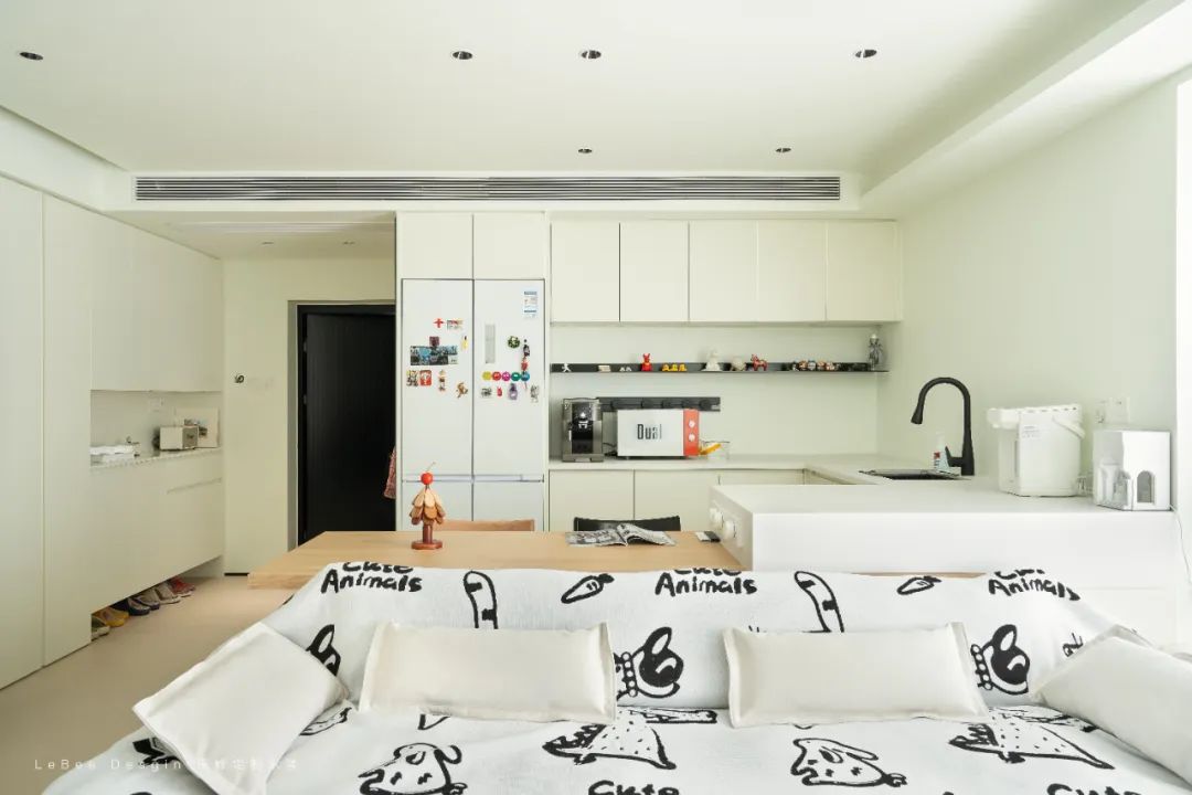 我們設計師結合客戶的意愿,加入了可愛的家庭成員空間,在客餐廳融入了會客,美食和休閑的主題功能。在空間引導上廚房開放。也加入美觀和實用的衣帽功能!