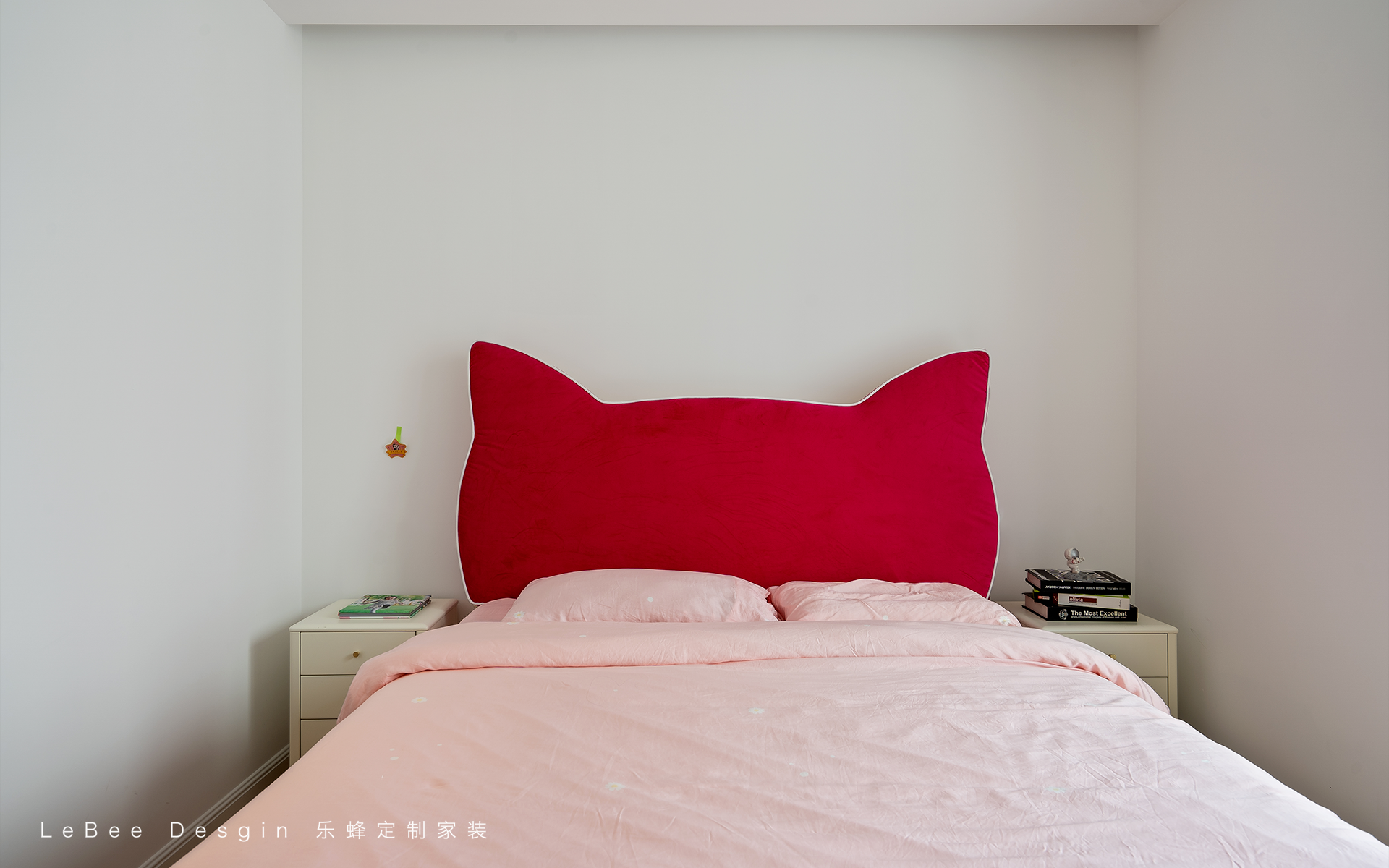 以柔和淺粉、白色為主,搭配亮眼玫紅床頭,營造甜美、活潑氛圍,契合兒童喜好。