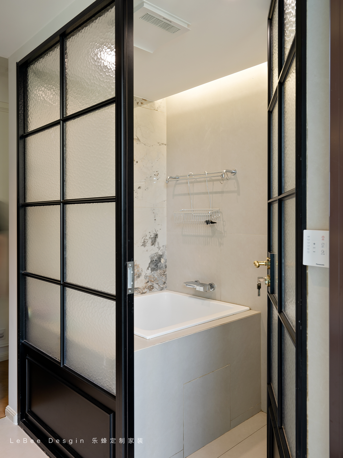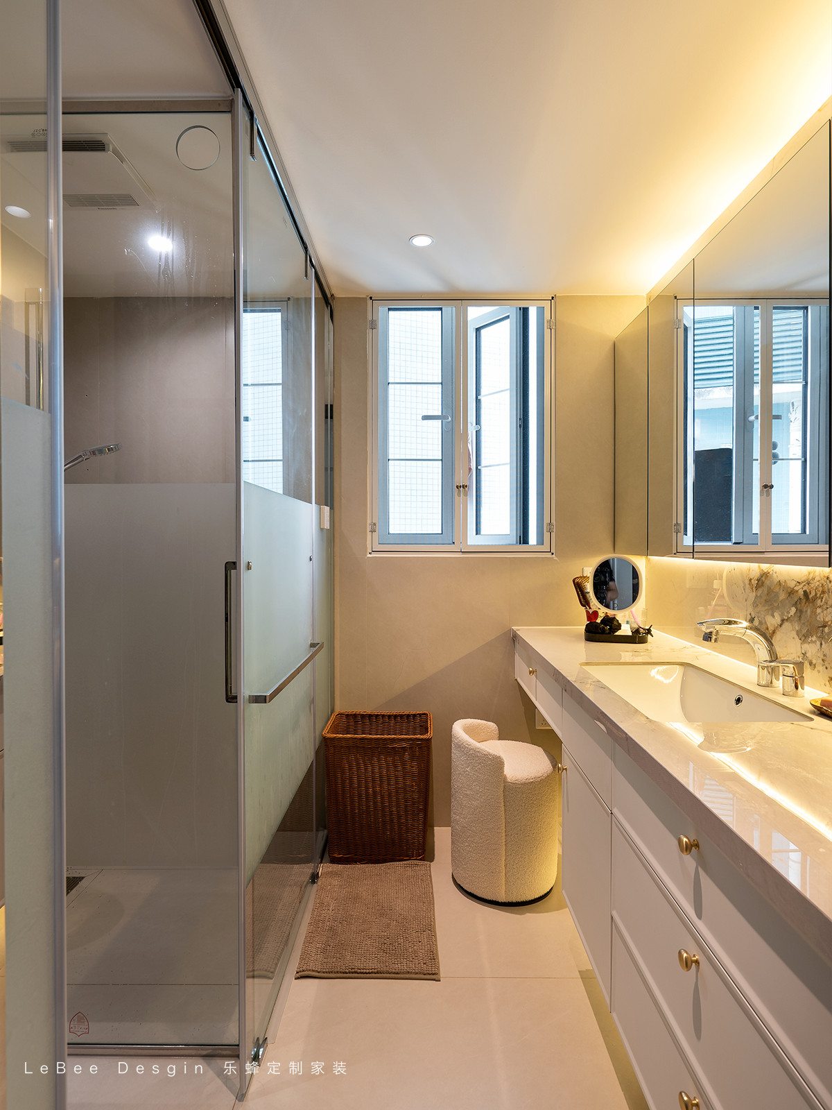 衛生間延續整體輕法式風格,通過簡潔線條、柔和燈光,搭配大理石紋理墻面,營造優雅精致氛圍,小空間也有品質感。