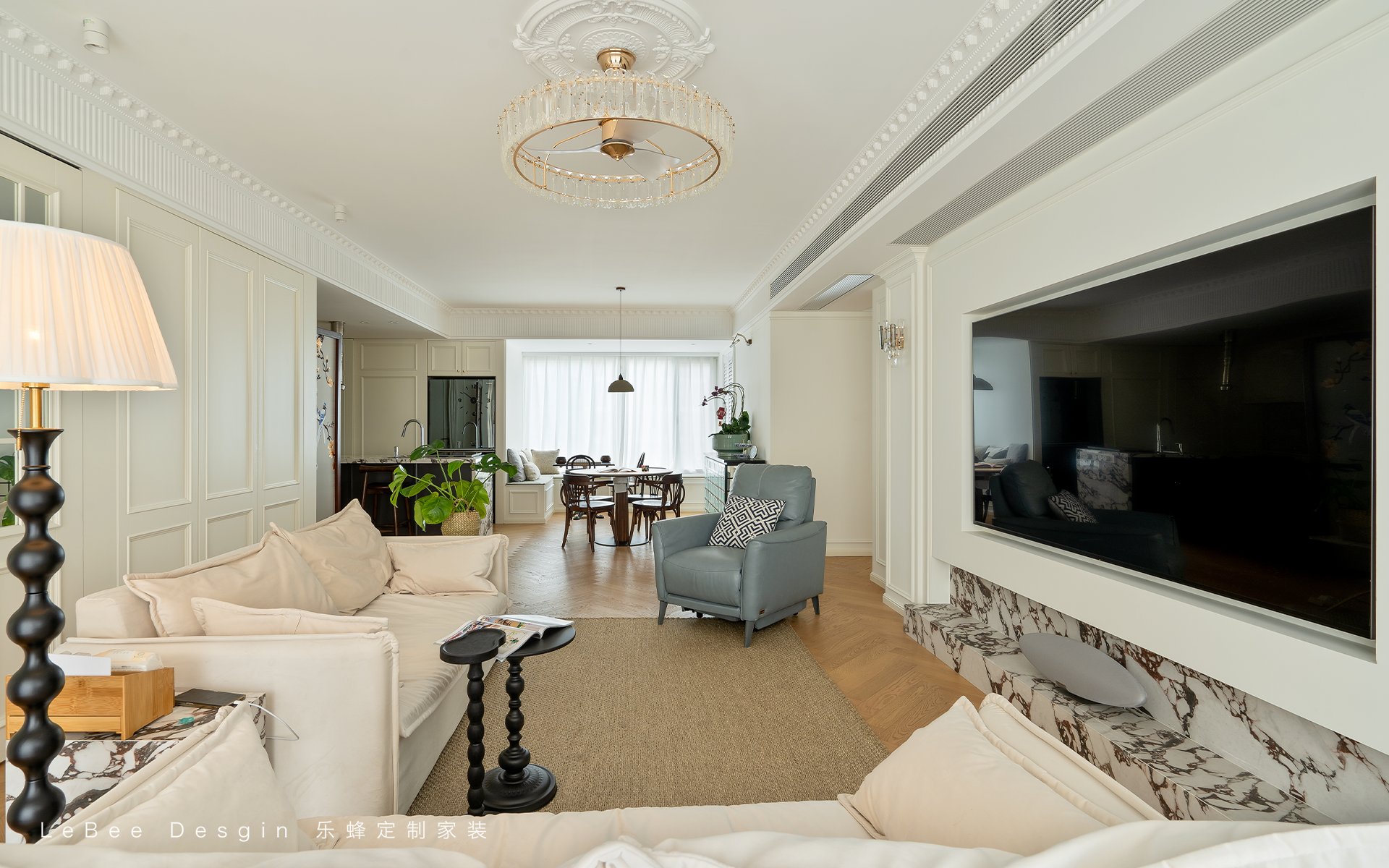 整體以輕法式為主,柔和的白色為主色調,搭配精致的線條裝飾營造出優雅、浪漫又不失溫馨的氛圍,同時簡化傳統法式的繁雜裝飾,更貼合現代生活需求。