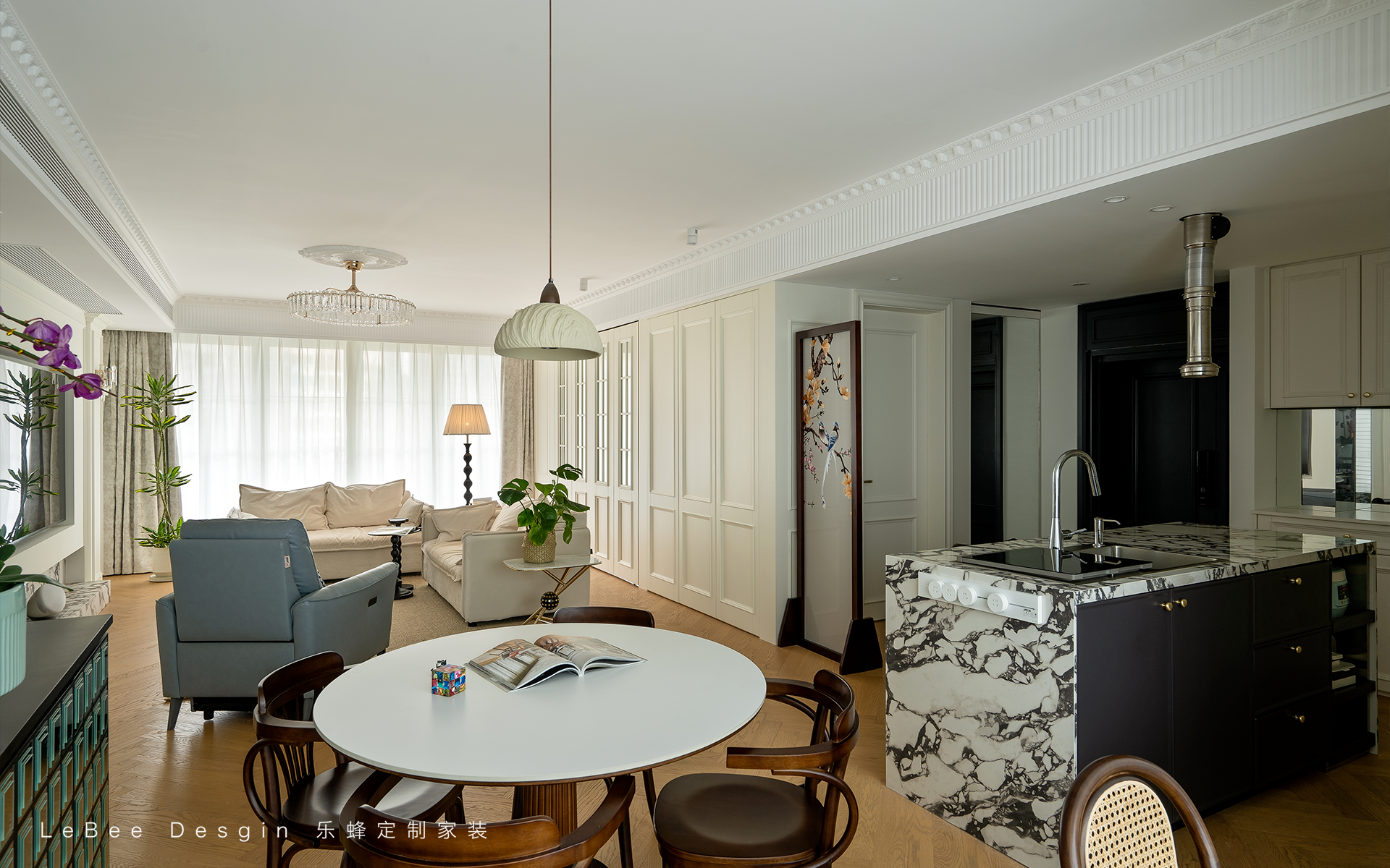 中島臺實現操作與互動功能,圓桌用餐區、窗邊卡座,豐富空間場景,動線流暢且增強交流感。