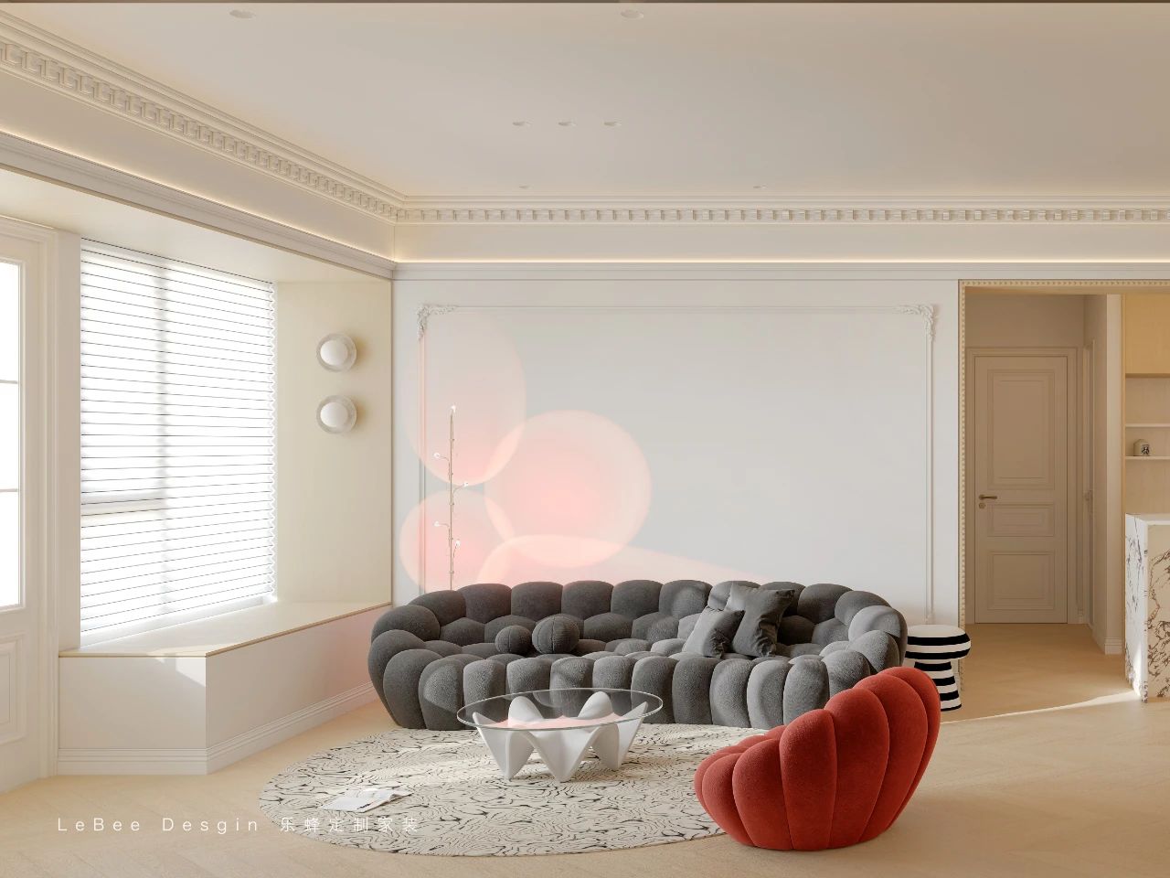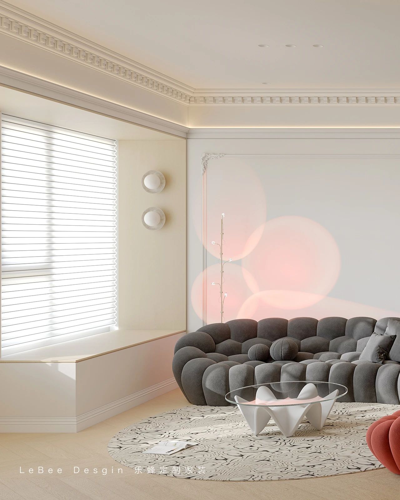 簡潔的平面無過多繁雜裝飾,通過光影(如粉色投影)增添靈動與藝術感,適配現代簡約與輕法式融合的空間風格,凸顯精致、大氣且不失溫馨的居住格調 。