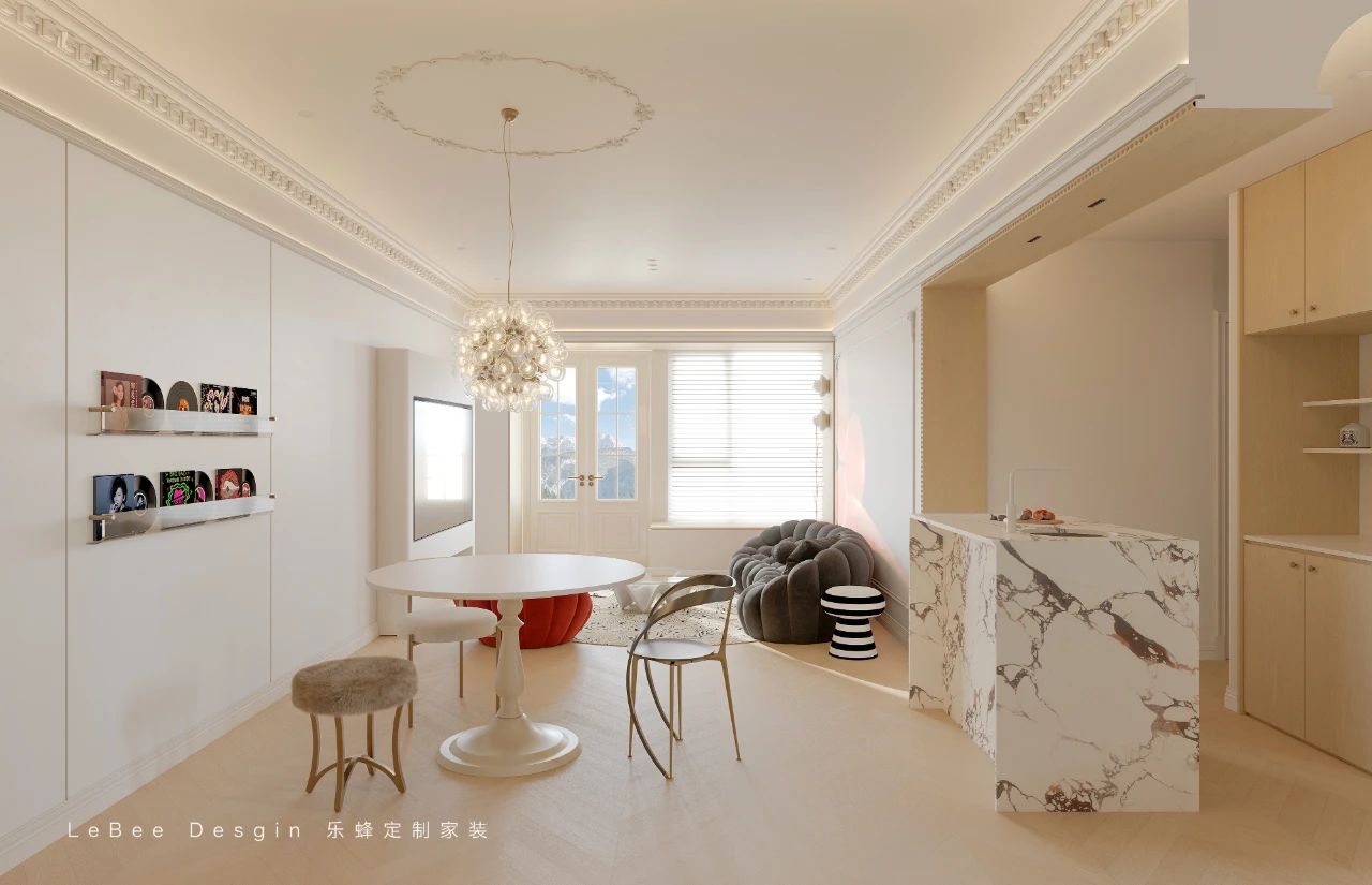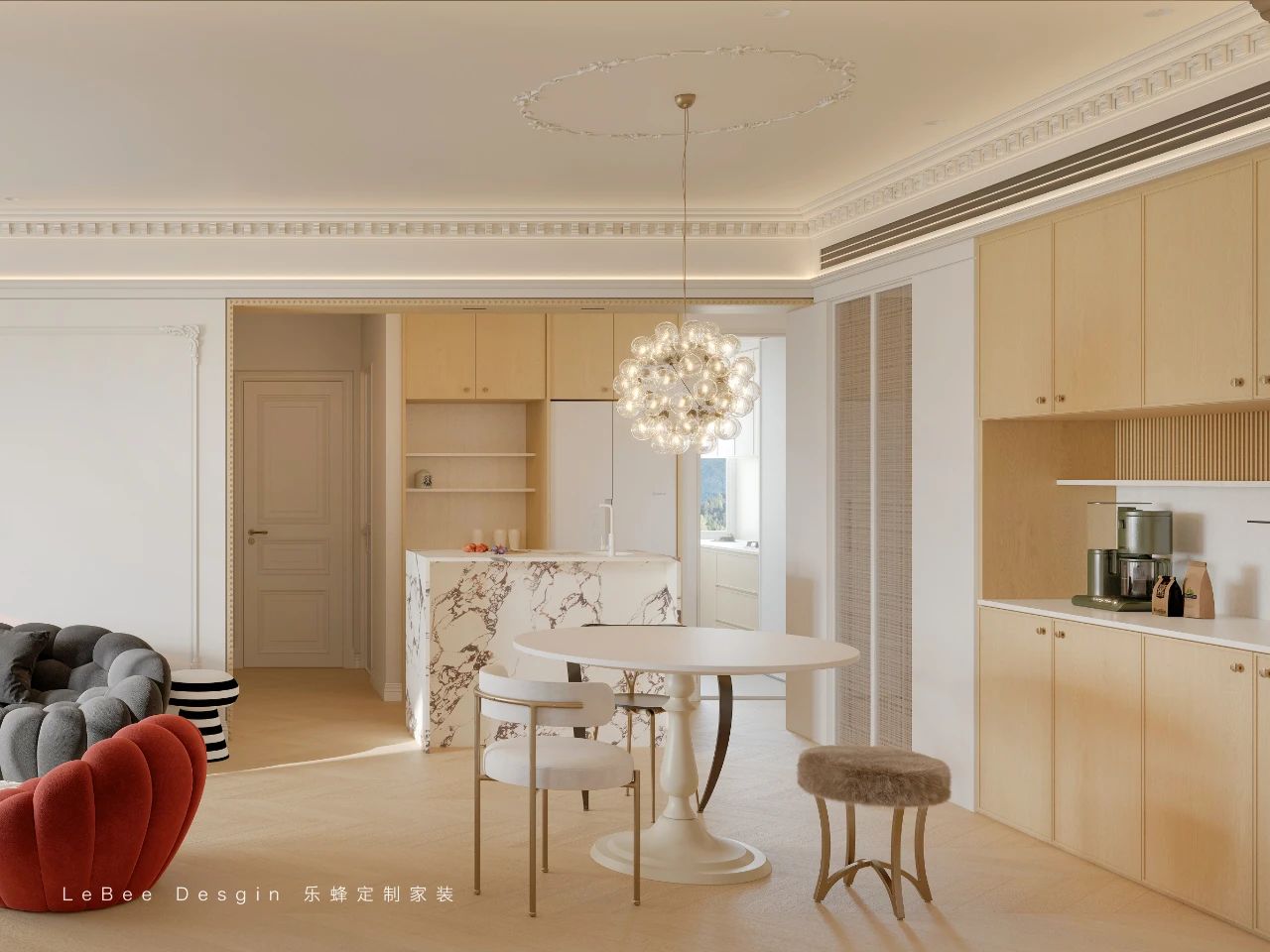 輕法式風格的餐廳設計,以淺木色柜體、白色墻面為基礎,搭配大理石紋理吧臺,增添精致感。