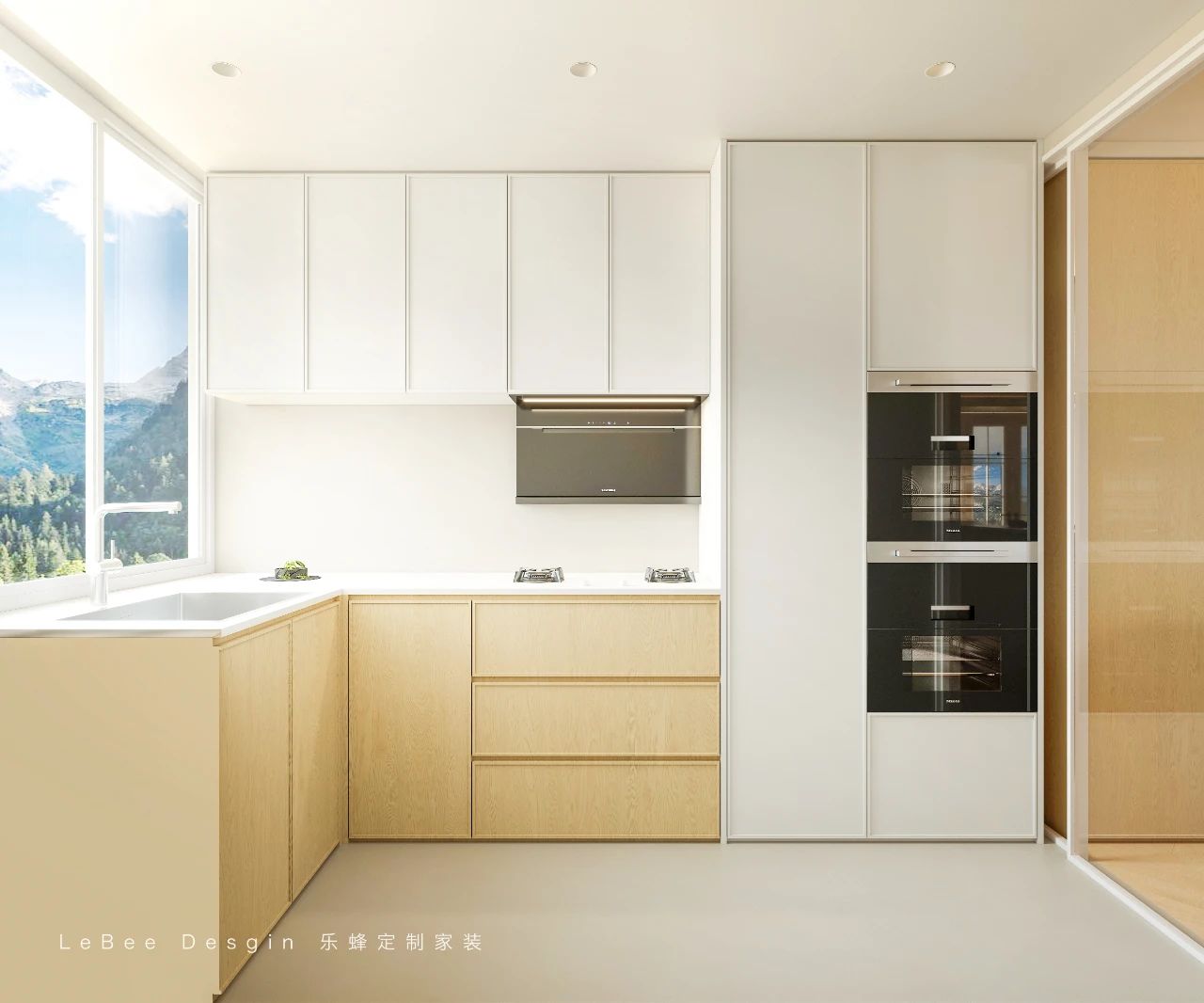 廚房L 型布局合理利用空間,操作臺面連貫。白色吊柜簡潔,淺木色地柜溫潤,嵌入一體化廚電(如烤箱、煙機 ),實現功能與美觀統一。
