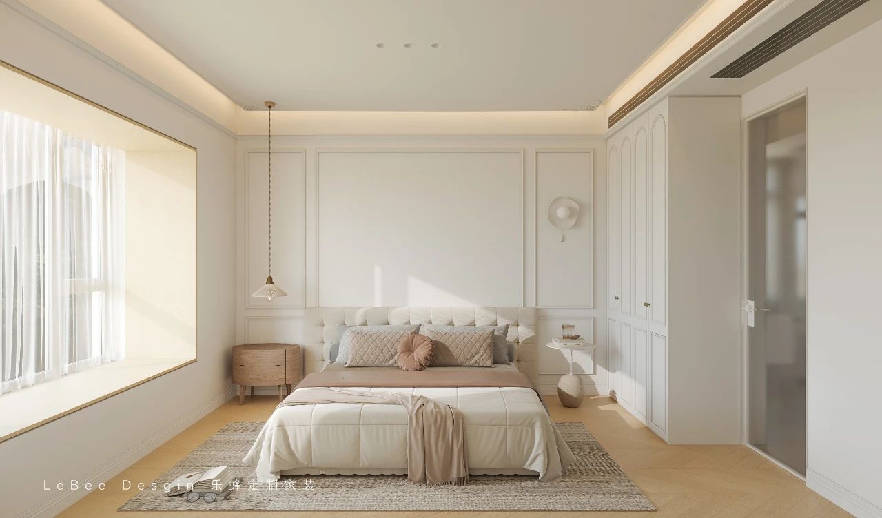 主臥以白色為主調,墻面石膏線添法式感。大窗采光絕,陽光一撒特舒服,床品軟乎乎配色溫柔。簡約木色家具實用又搭,住進去就想賴著,滿是踏實舒服的家的氛圍 。