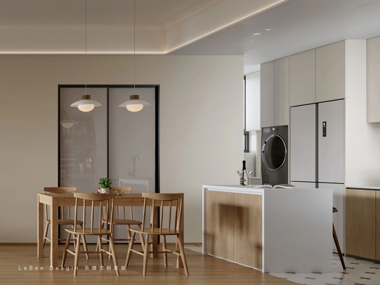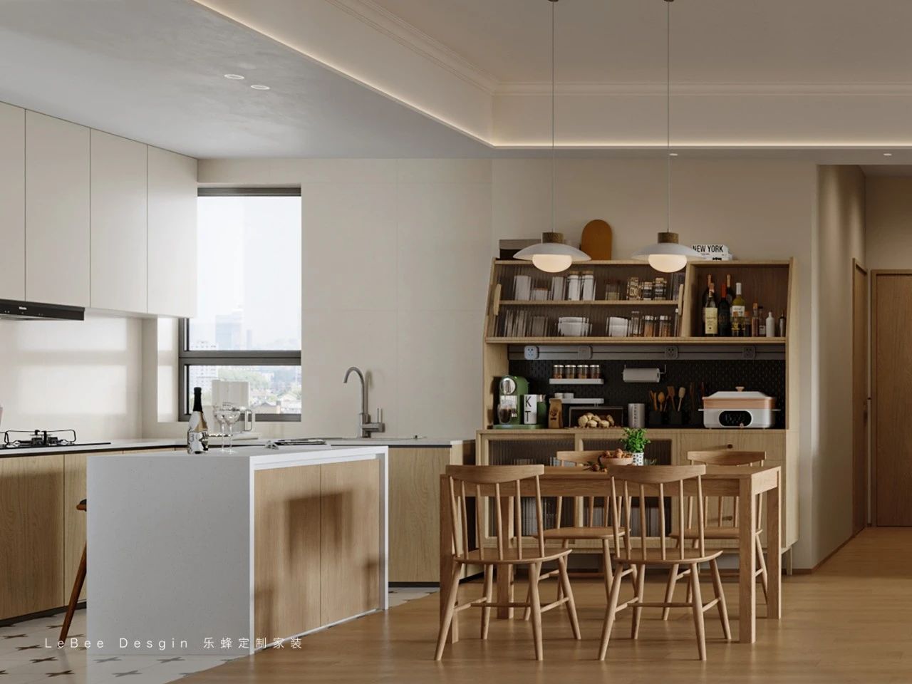 餐廚區域采用現代簡約開放式設計,淺木色櫥柜搭配白色中島臺,溫馨又顯開闊,中島臺既是備餐區,也能臨時湊活頓簡餐;餐邊柜分層收納,常用物品隨手拿,雜物藏起來,整潔又有序。