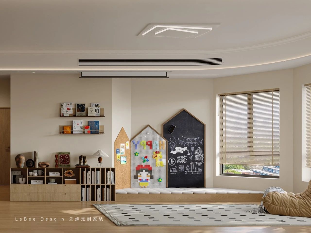 以淺米色墻面為基底,用小房子造型的軟木板、黑板墻打造互動區,滿足親子創作需求,搭配墻面擱板、木質矮柜,實現書籍、擺件收納展示,兼具文藝氛圍。