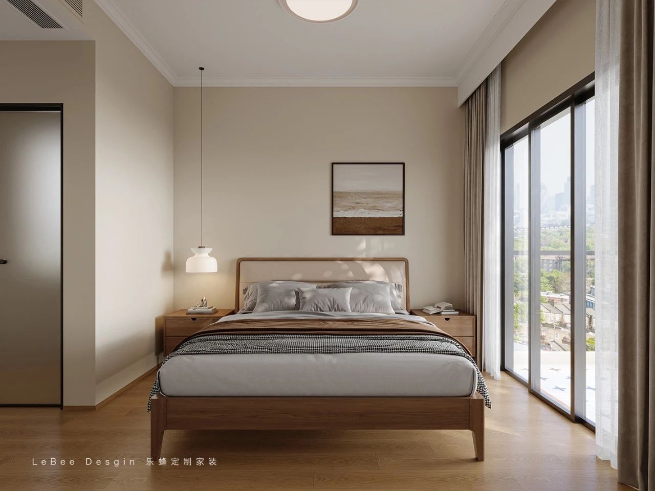 淺米色墻面營造溫馨感。木質床具質樸溫潤,搭配簡約床品,舒適又顯格調。單側吊燈、對稱床頭柜,布局規整有序。