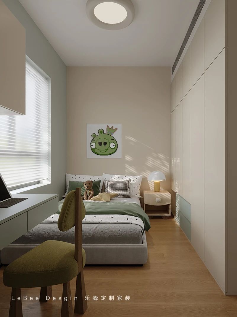 淺色調墻面營造柔和氛圍,搭配童趣裝飾畫增添活潑感。一體化定制衣柜節省空間,滿足收納需求。