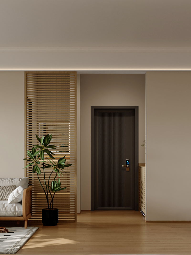 入戶低飽和暖色調墻面、地板營造溫馨柔和氛圍。木質格柵隔斷,讓空間過渡自然且具層次;深色入戶門搭配智能鎖,沉穩又顯科技便捷。