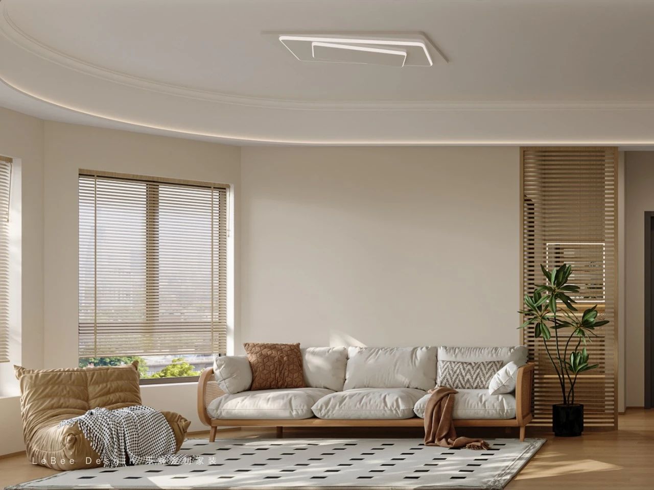 沙發背景墻設計,圍繞兒童友好與多元功能展開:以柔和淺米色為底色,原木沙發+木地板通鋪,構建可自由創作、互動的童趣區域,契合孩子成長需求。